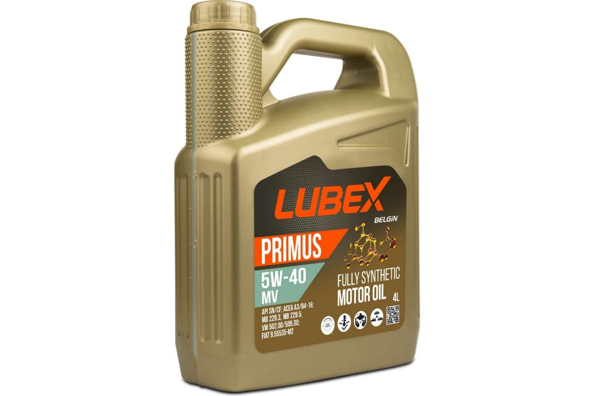 Синтетическое моторное масло Lubex PRIMUS MV 5W-40 CF/SN A3/B4, полностью синтетическое моторное масло с высокими эксплуатационными характеристиками, произведенное на основе специально подобранных синтетических базовых масел и технологии присадок, подходящее для использования в бензиновых и дизельных двигателях легковых автомобилей и легкого коммерческого транспорта.Используется для бензиновых и дизельных легковых автомобилей и легкого коммерческого транспорта, особенно для двигателей нового поколения, разработанных европейскими производителями. Подходит для многих моделей автомобилей с двигателями без наддува, с непосредственным впрыском, турбонаддувом и с многоклапанными двигателями.