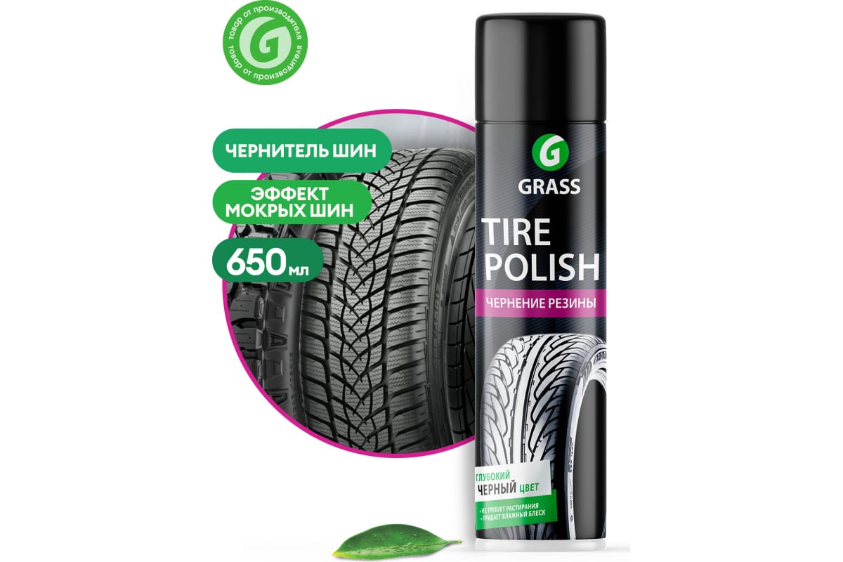 Чернитель шин Grass Tire Polish 650 мл 700670 - профессиональный состав в удобной форме аэрозоля для полировки шин, а также других резиновых изделий автомобиля. Чернитель резины восстанавливает черный цвет, обновляет поверхность, придает глянцевый блеск с эффектом мокрых шин. Предохраняет от растрескивания и воздействия ультрафиолета, обладает приятным ароматом тропических фруктов. Состав готов к применению.Меры предосторожности: не допускать попадания на стекла и зеркала. При попадании на кожу или слизистую оболочку промыть большим количеством воды с мылом.